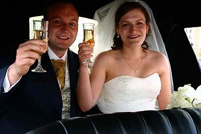 Celebrate with us! Jon and Claire May toast in the back seat of their