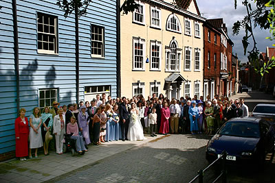 All the invited guests of Jon and Claire gather in the street of Norwich,