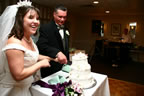 While cutting the cake with new husband Greg, Roberta responds with laughter