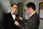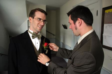 Final adjustments: A groomsman fastens a flower to Martin's lapel before
