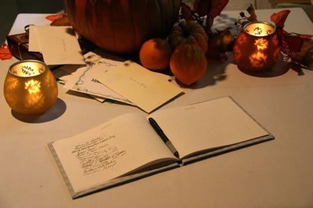 Guest book, decorated by mini-jack-o-lanterns for Shelly's October wedding